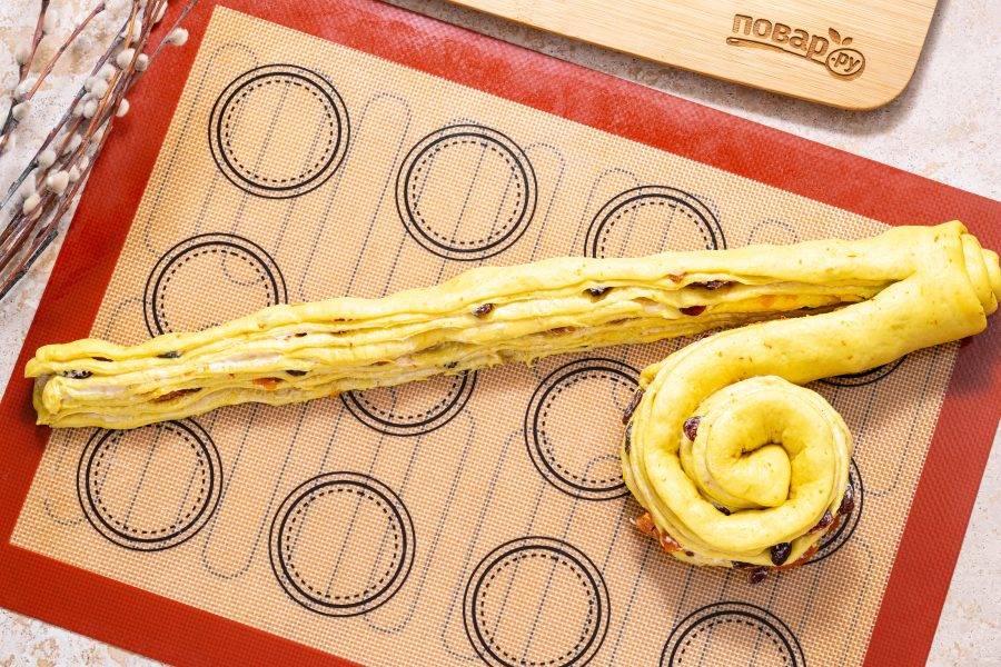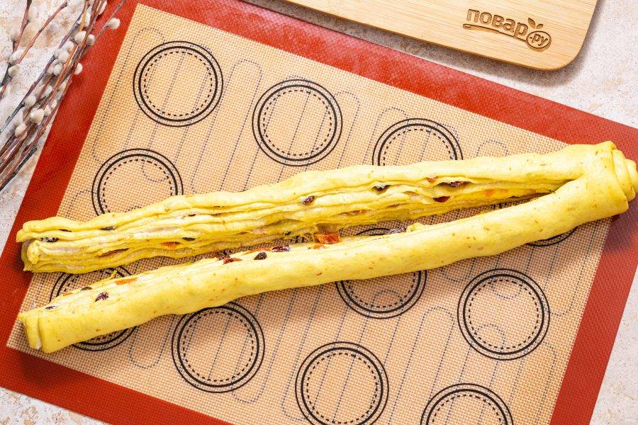 Затем закатайте каждую половину слоями снаружи. Поставьте одну друг на друга и сформируйте краффин по размеру формы для выпечки.
