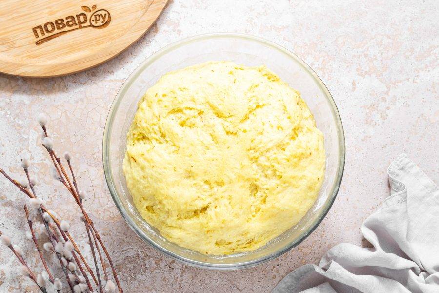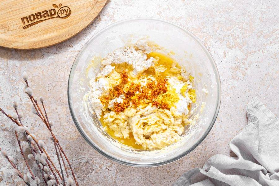 Влейте растопленное сливочное масло, добавьте цедру. Замесите мягкое, однородное тесто.