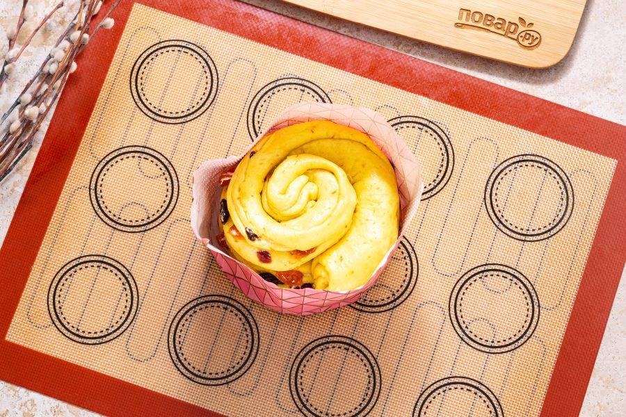 Переложите его в форму для кулича. Выпекайте примерно 40-45 минут в разогретой до 180 градусов духовке.