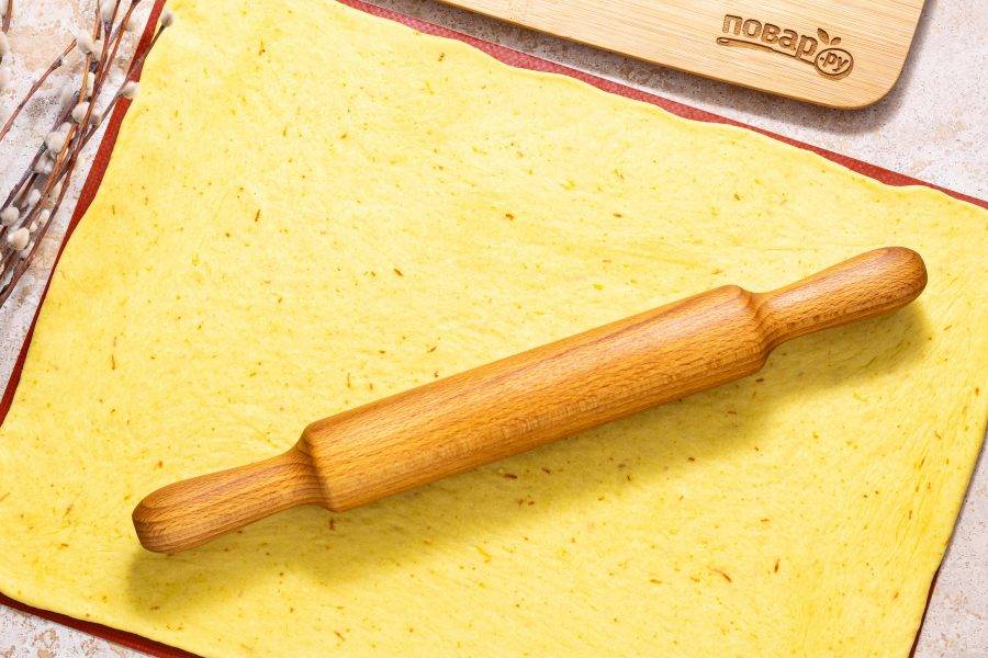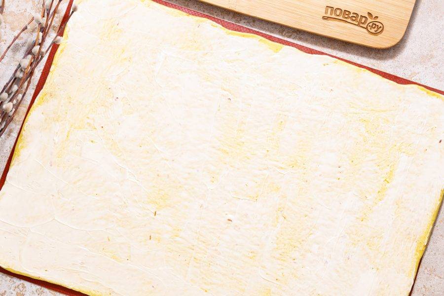 Аккуратно раскатайте тесто в тонкий прямоугольный пласт.