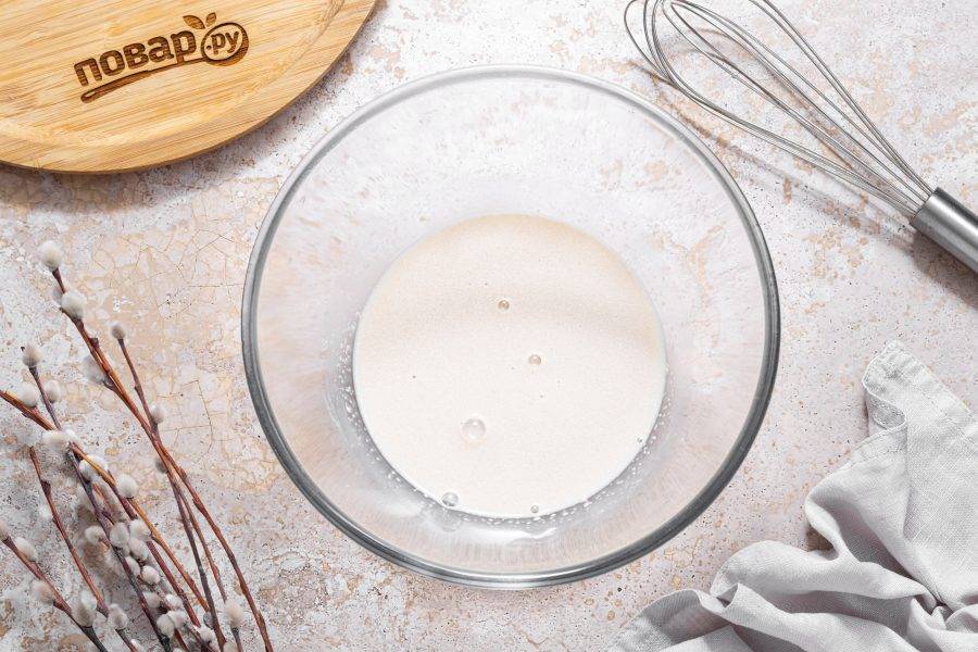 В начале разведите в теплом молоке дрожжи с 1 ст.л. сахара. Оставьте на 10-15 минут.