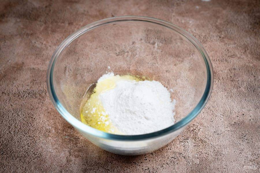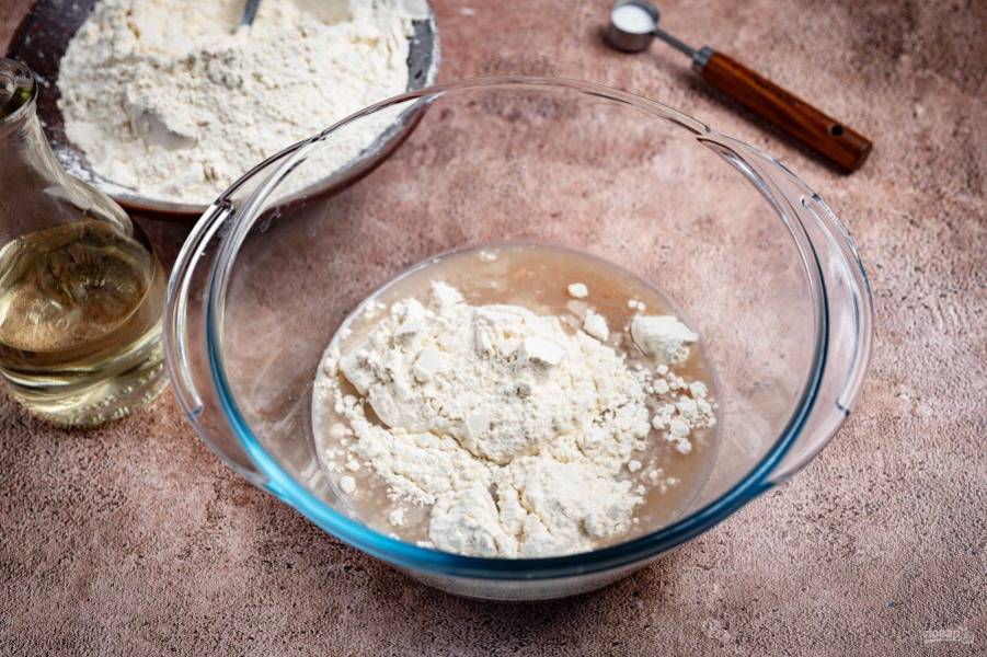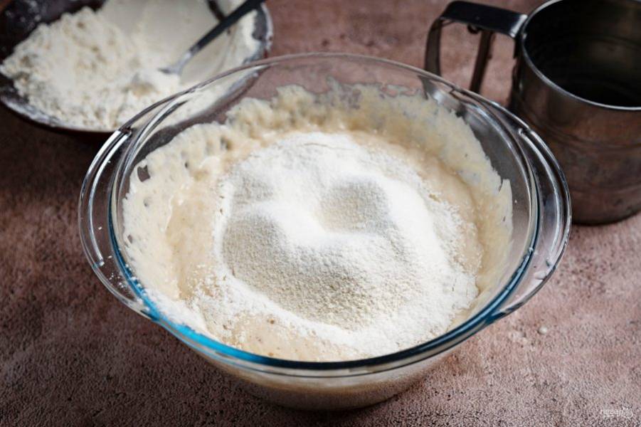 Добавьте к дрожжевой смеси 2-3 столовые ложки муки.