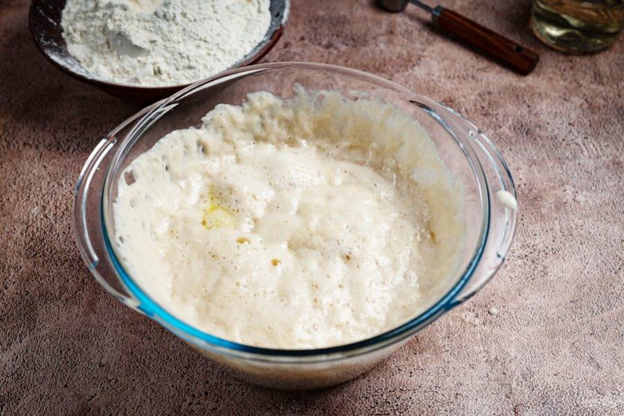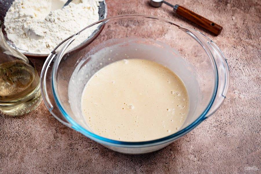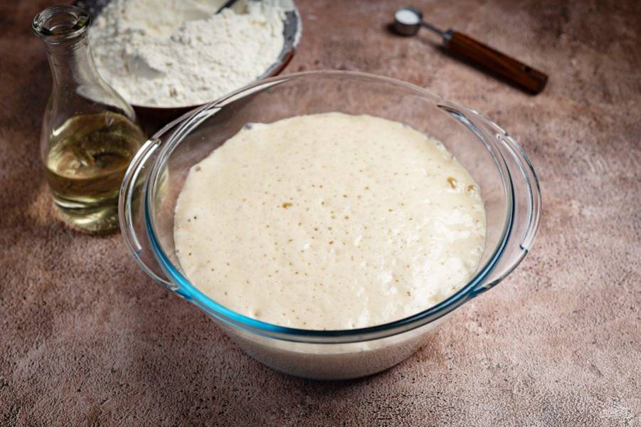 Перемешайте венчиком все ингредиенты до получения однородной смеси — опара готова. Опару в миске оставьте в покое на 30 минут, прикрыв предварительно кухонным полотенцем.