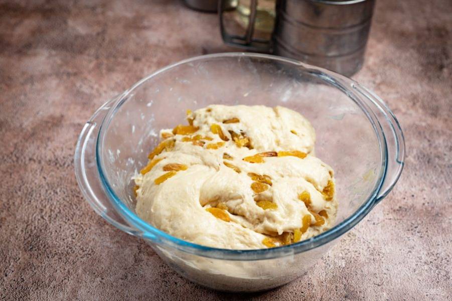 Вмешайте изюм до равномерного распределения по тесту.