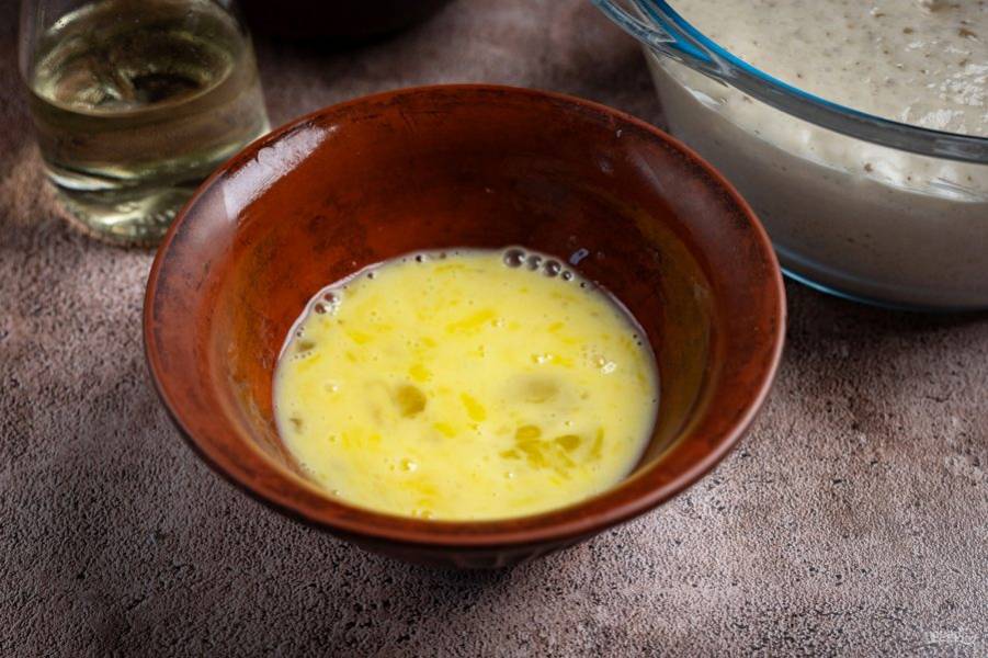Эту яичную смесь залейте в опару и перемешайте.