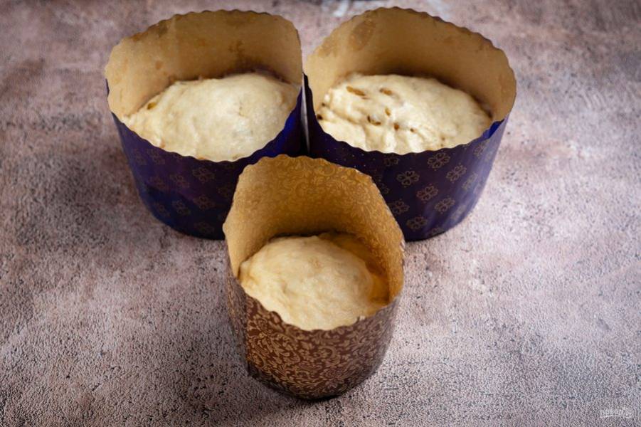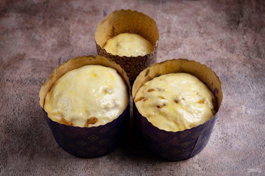 Через 30 минут смажьте поверхность каждого будущего кулича взболтанным желтком и отправьте выпекаться в заранее разогретую до 180 градусов духовку на 25-35 минут.