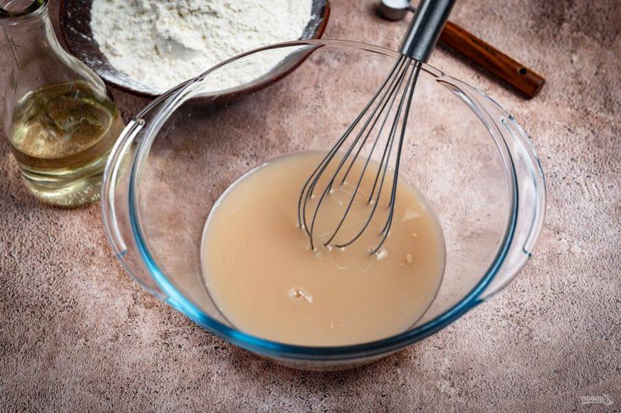 Залейте теплую воду и активно перемешайте венчиком до полного растворения дрожжей.