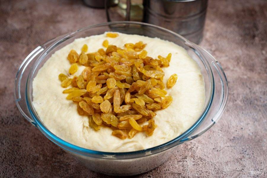 К тесту добавьте весь изюм.