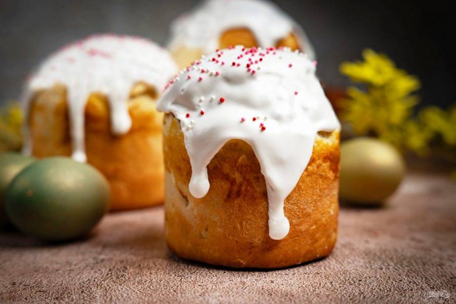 Куличи покройте глазурью и присыпьте кондитерской посыпкой при желании.