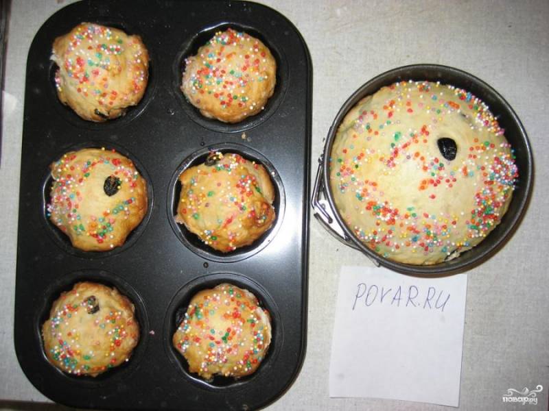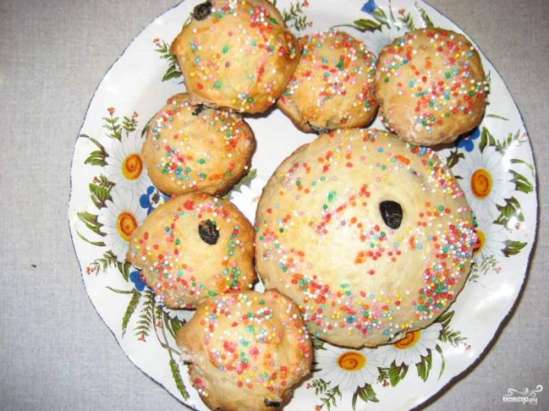 В 400 мл горячего молока всыпать 4 стакана муки. Хорошо растереть. Подождать, когда остынет до 45-55 градусов. В полстакане теплого молока развести дрожжи, влить их в массу с мукой. дать подняться тесту. Желтки отделить от белков, добавить желтки в массу, белки взбить в пену и тоже добавить. Всыпать оставшиеся 4 стакана муки. Вымесить тесто, чтобы отставало от рук. добавить соль, пряности, сахар, теплое масло, изюм, вымесить тесто еще раз. Подождать, пока поднимется. Выпекать в духовке до готовности (минут 40 - большие куличи, минут 15 - 20 - маленькие). Получилось 2 больших, 1 средний, 12 маленьких. Для маленьких использовала формочки для кексиков.