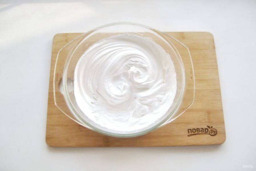 Пока куличи остывают сделайте безе. Для этого белки выложите в миску и добавьте 120 грамм сахара. Поставьте миску на водяную баню так, чтобы её дно не касалось воды. Нагрейте воду. Перемешайте белки с сахаром, пока он не растворится. После начинайте взбивать миксером. Через 5-6 минут белки начнут густеть. Когда рисунок от миксера на белках перестанет расплываться, снимите миску с водяной бани и продолжайте взбивать еще 3-4 минуты. Безе должно хорошо держать форму и иметь плотную, гладкую структуру, похожую на зефир.