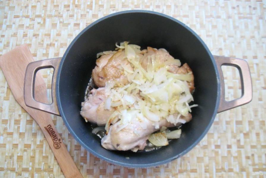 Курицу помойте, обсушите и выложите в кастрюлю с толстым дном.