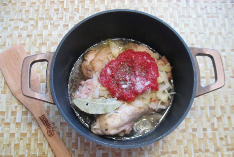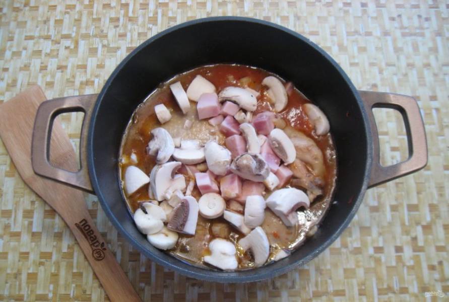 Накройте кастрюлю крышкой и тушите курицу со специями, вином и томатами до готовности. После добавьте нарезанный бекон или ветчину.