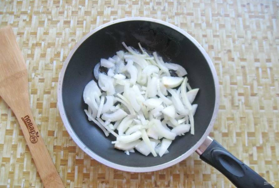 Репчатый лук очистите, помойте и нарежьте. Выложите в сковороду, налейте немного масла и обжарьте до прозрачного состояния.