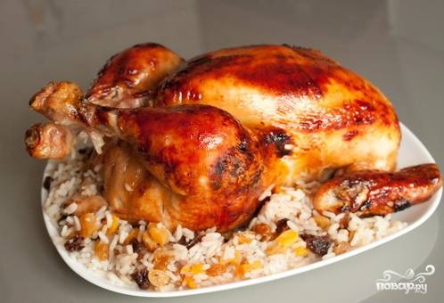 Из готовой курочки выньте рис, на него выложите готовую птицу. Подавайте блюдо к столу. Приятного аппетита!