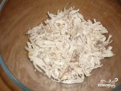 2. Если ссылаться на оригинал рецепта, то мясо должно быть сырое. Не все готовы на такие риски и эксперименты, а значит, рецепт можно немного адаптировать. Куриную грудку отварить до готовности и хорошо остудить. Нарезать тонкими полосками и выложить в глубокую миску.