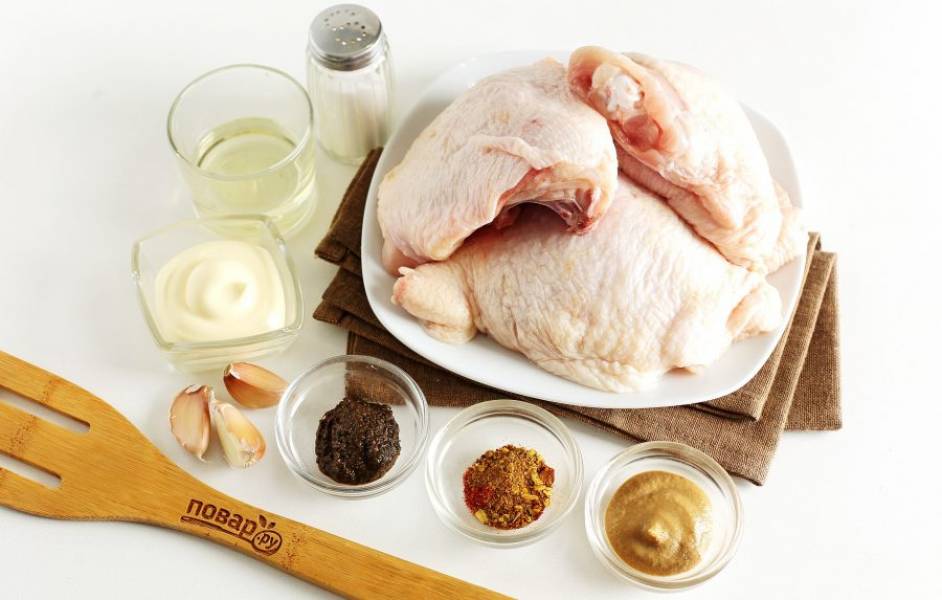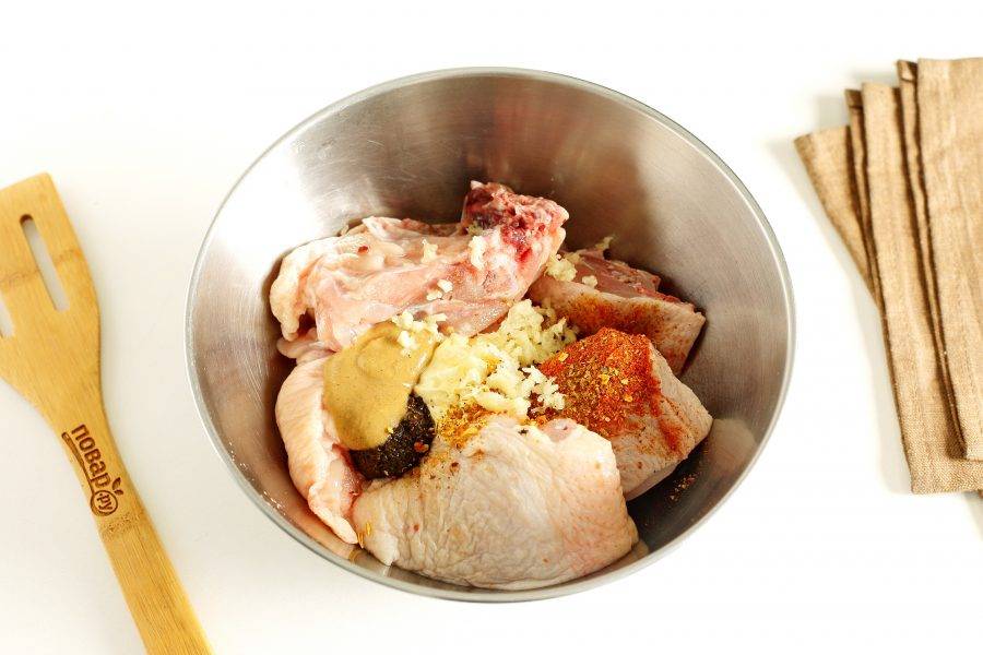 Добавьте ингредиенты для маринада: аджику, горчицу, майонез, давленый чеснок, соль и специи по вкусу.