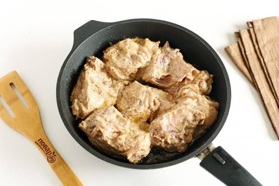 Жарьте мясо под крышкой на среднем огне до румяной корочки снизу. Затем переверните и уже без крышки доведите мясо до полной готовности на небольшом огне.