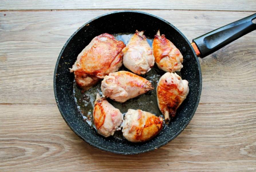 Курицу разделайте на порционные куски, у меня уже разделанный набор, сполосните и обсушите. В сковороде растопите масло и обжарьте курицу со всех сторон на сильном огне до румяной корочки.