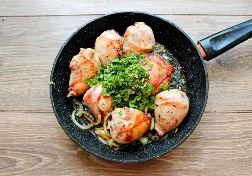 Петрушку сполосните и мелко порежьте, добавьте в сковороду.