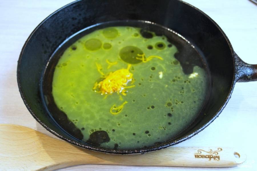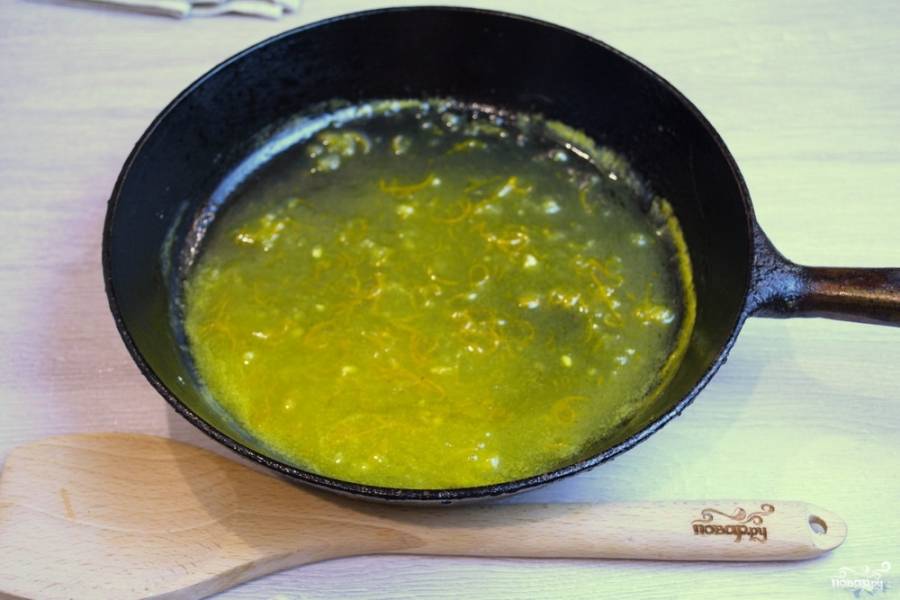 Когда мясо будет готово, снимите его со сковороды. В сковороду влейте апельсиновый сок и добавьте цедру. Дайте закипеть. Варите 5 минут. Добавьте чайную ложку муки. Быстро перемешайте.