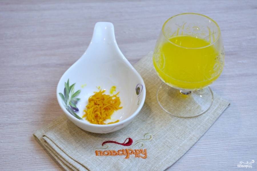 Апельсины необходимо вымыть и ошпарить кипятком. Дайте апельсину остыть. Снимите с него цедру. Отложите её пока в сторону. Разрежьте апельсин пополам, выдавите из него сок.