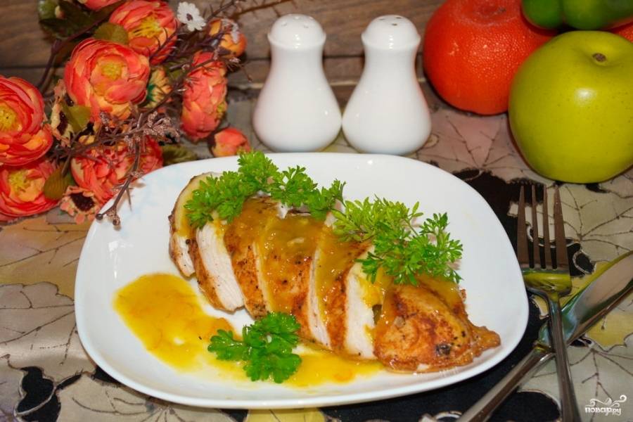 Куриное мясо нужно нарезать на небольшие кусочки. Выложите его на блюдо, полив подготовленным апельсиновым соусом.