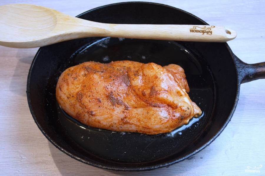 Куриное филе натрите специями и солью со всех сторон. Разогрейте сковороду. На растительном масле обжарьте куриное филе целиком с двух сторон (под крышкой).