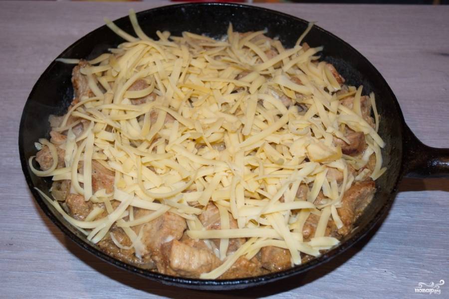 На крупной терке натрите твердый сыр. Посыпьте им сверху почти готовое мясо. Сковороду перенесите в разогретую духовку, запекайте мясо в сковороде около 10 минут. В случае, если нет сковороды, в которой мясо можно поставить в духовку, переложите мясо в форму для запекания и продолжите процесс приготовления в духовке.