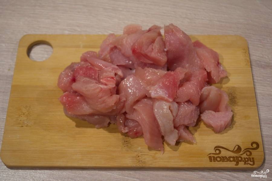 Для приготовления курицы под сырным соусом нам необходимо взять мясо птицы, обмыть его и обсушить. Мякоть нарезаем на небольшие кусочки. Для приготовления блюда лучше взять сковороду, которую позднее можно будет поставить в духовку. Подойдет чугунная сковорода с металлической ручкой или стальная.