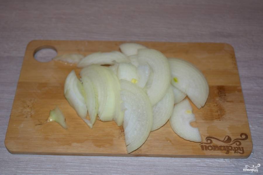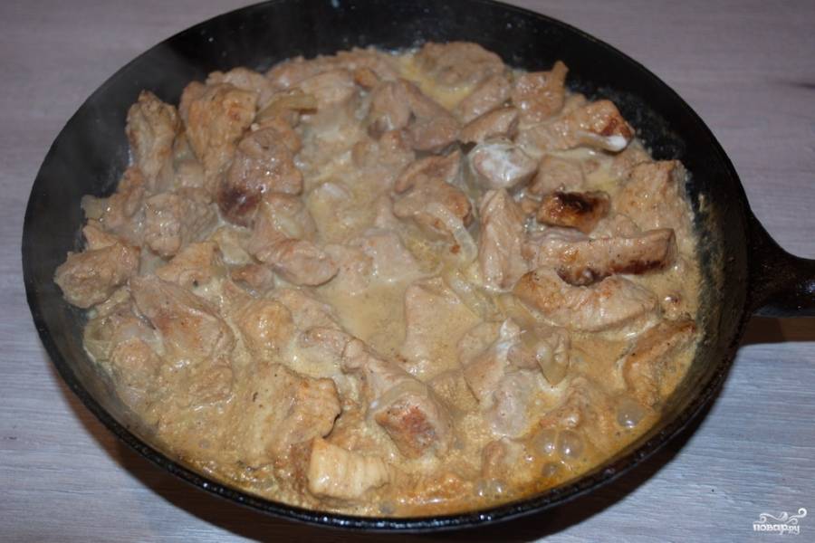 К обжаренному мясу добавьте репчатый лук. Перемешайте. Жарьте все вместе. Мясо скорее будет тушиться, чем жариться. Влейте в сковороду 1 стакан кипятка. Вода соберет мясные соки. Сделает мясо более сочным. Накройте сковороду крышкой, тушите 10-15 минут.