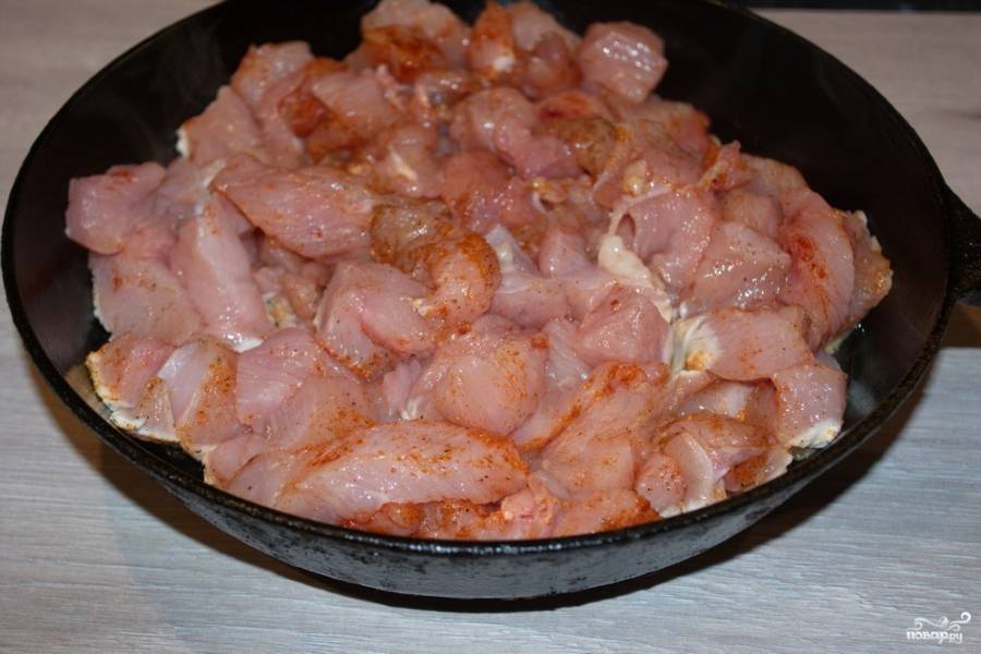 Разогрейте сковороду. Влейте на сковороду растительное масло. Разогрейте его. Выложите мясо птицы. Солить и перчить пока не надо. Дайте мясу обжариться. Теперь добавьте специи по вкусу, а также соль.
