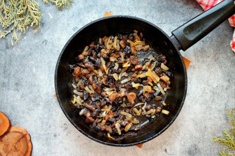 Репчатый лук мелко порежьте, шампиньоны порежьте дольками. В сковороду налейте оставшееся растительное масло, положите репчатый лук и обжаривайте в течение 3 минут. Добавьте в сковороду шампиньоны и жарьте еще 3-5 минут.