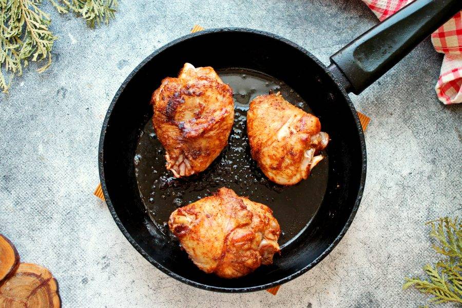 В сковороду налейте половину растительного масла и разогрейте на среднем огне. Выложите кусочки курицы и обжаривайте с двух сторон до румяной корочки. На это уйдет примерно по 5 минут с каждой стороны. Переложите курицу в тарелку и накройте.