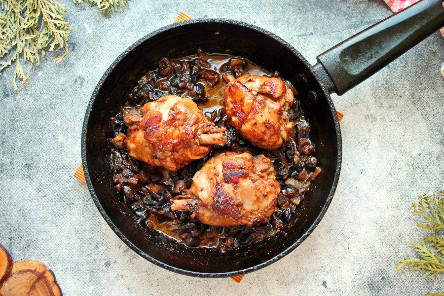 Грибы посолите, верните в сковороду обжаренную курицу, влейте вино и доведите все до кипения.