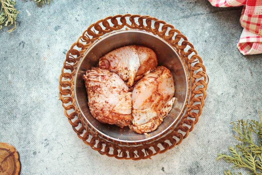 Курицу, у меня голень, вымойте в холодной воде и обсушите. Курицу положите в миску, посолите, поперчите и посыпьте паприкой. Все перемешайте и оставьте мариноваться в течение 20 минут.