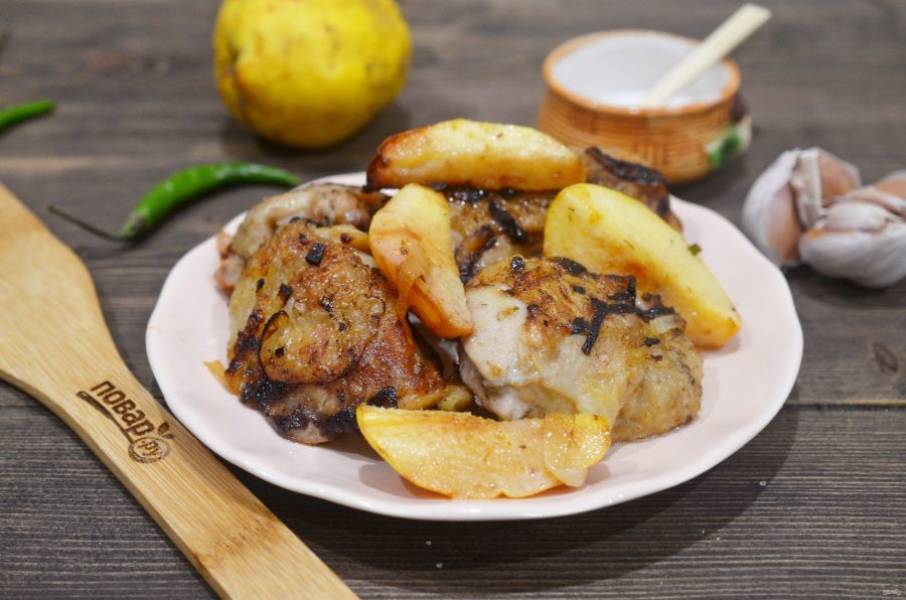4. Уберите айву из сковороды и обжарьте в ней же курицу по 3-5 минут с каждой стороны.