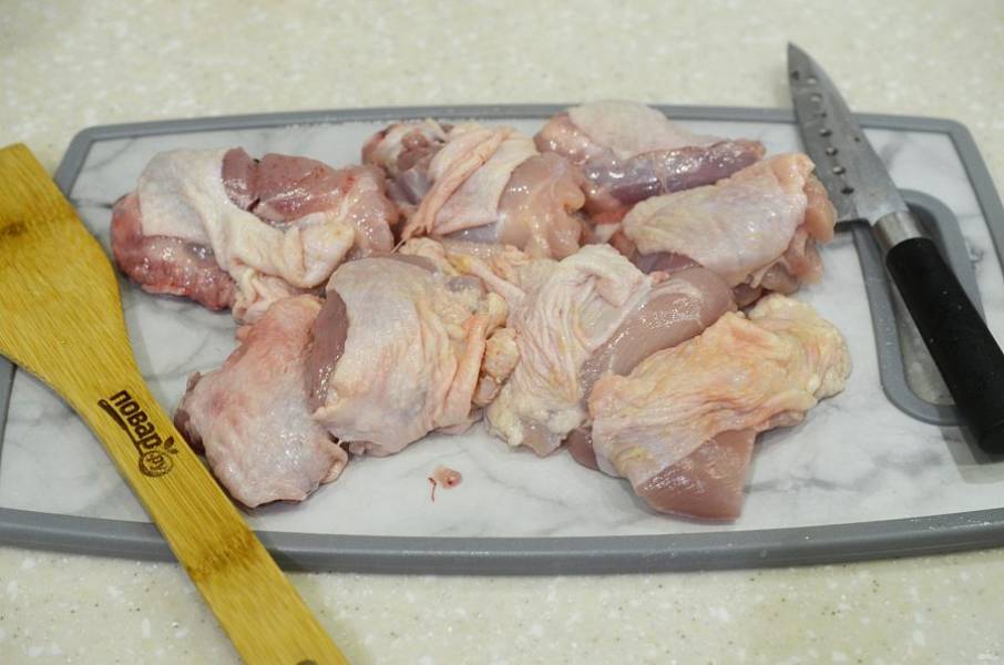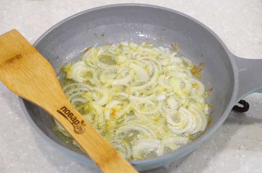5. Уберите курицу из сковороды. Лук нарежьте полукольцами и обжарьте в той же сковороде.