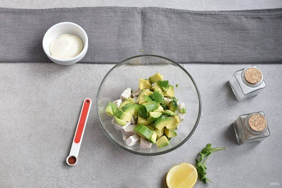 Авокадо очистите. Половинку нарежьте кубиками размером как куриные. Добавьте в миску и сбрызните ложечкой лимонного сока, чтобы авокадо не темнело.