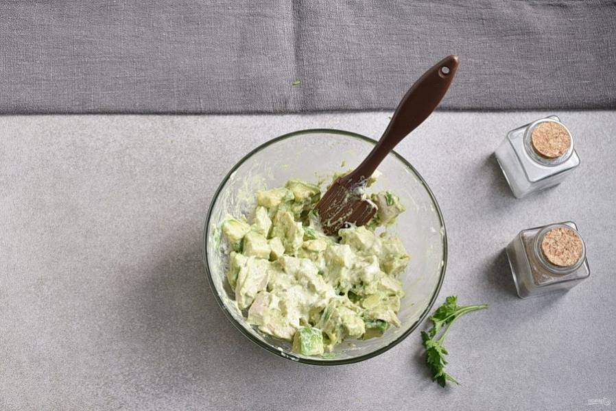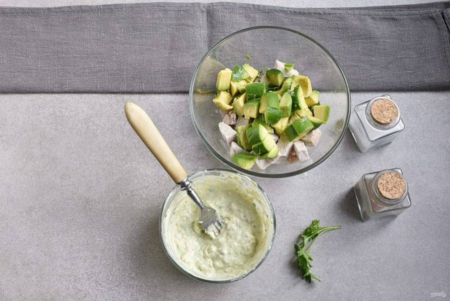 Вторую половинку авокадо разомните вилкой и смешайте с майонезом, давленым чесноком и лимонным соком. Посолите и поперчите по вкусу, добавьте немного перца чили. Хорошо перемешайте.