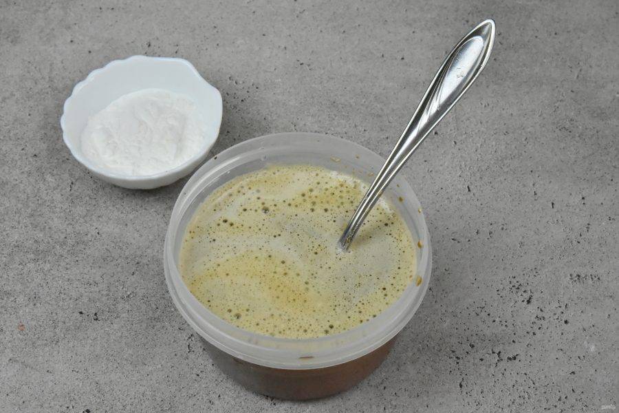 Пока обжариваются овощи подготовьте соус. Для этого измельчите чеснок и соедините его с соевым соусом и тростниковым сахаром.