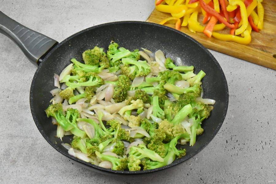 Брокколи разберите на соцветия. К обжаренному луку добавьте брокколи и обжаривайте еще 3-4 минуты.