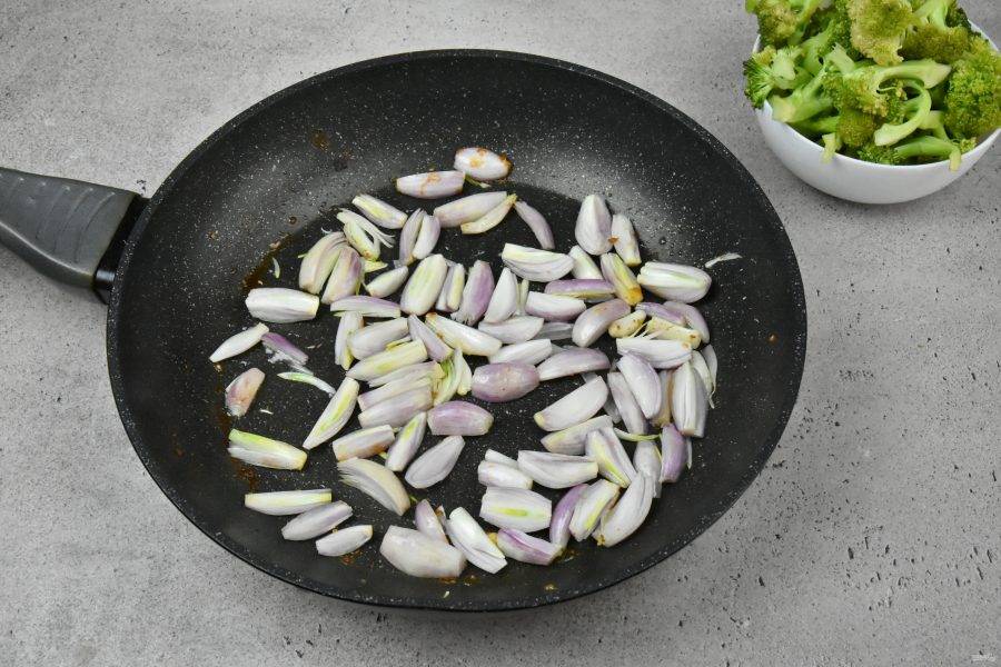 Лук шалот очистите от шелухи и нарежьте перьями. В сковороду, где обжаривалась курица, влейте по необходимости небольшое количество оливкового масла и пассеруйте лук до мягкости и прозрачности.