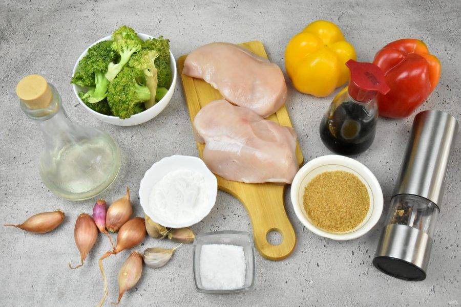 Болгарский перец нарежьте дольками, предварительно освободив его от перегородок и семян. Используйте перец разного цвета, так блюдо будет выглядеть ярче и аппетитнее. Выложите в сковороду к овощам дольки болгарского перца и обжарьте еще 2-3 минуты. Переложите к овощам отложенное ранее обжаренное куриное филе и залейте все подготовленным соусом. Перемешайте и томите до приобретения соусом густой, обволакивающей консистенции. Попробуйте блюдо и скорректируйте вкус.