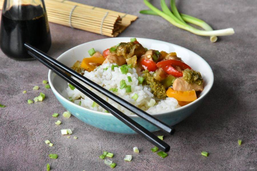Подавайте курицу с отварным рисом или лапшой, присыпав сверху измельченным зеленым луком. Для текстуры можно добавить в блюдо рубленый арахис или кунжут.
