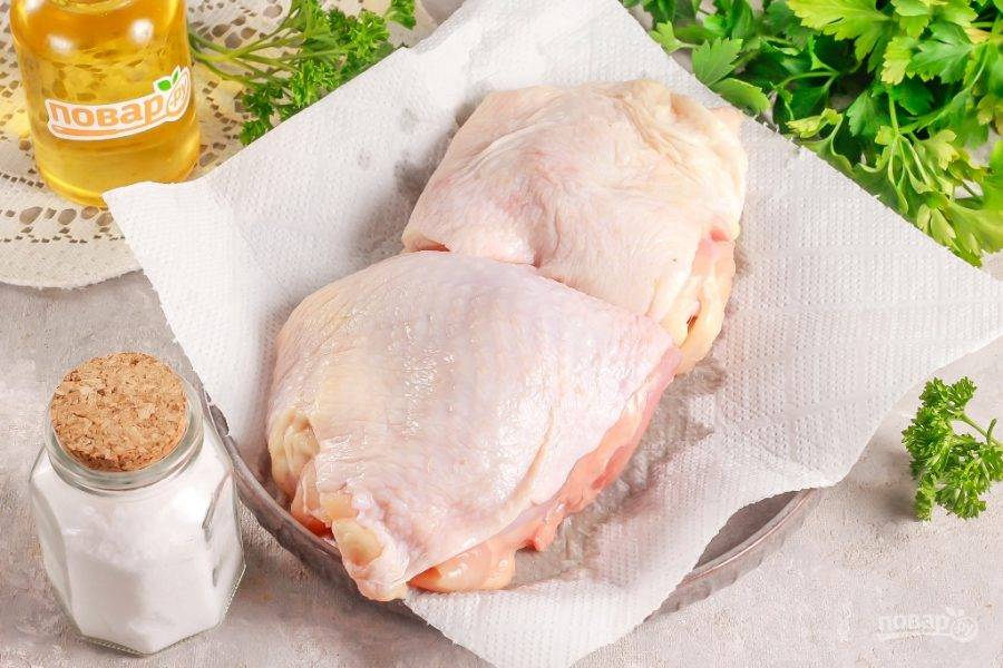 Части курицы промойте в теплой воде и обсушите бумажными салфетками со всех сторон.