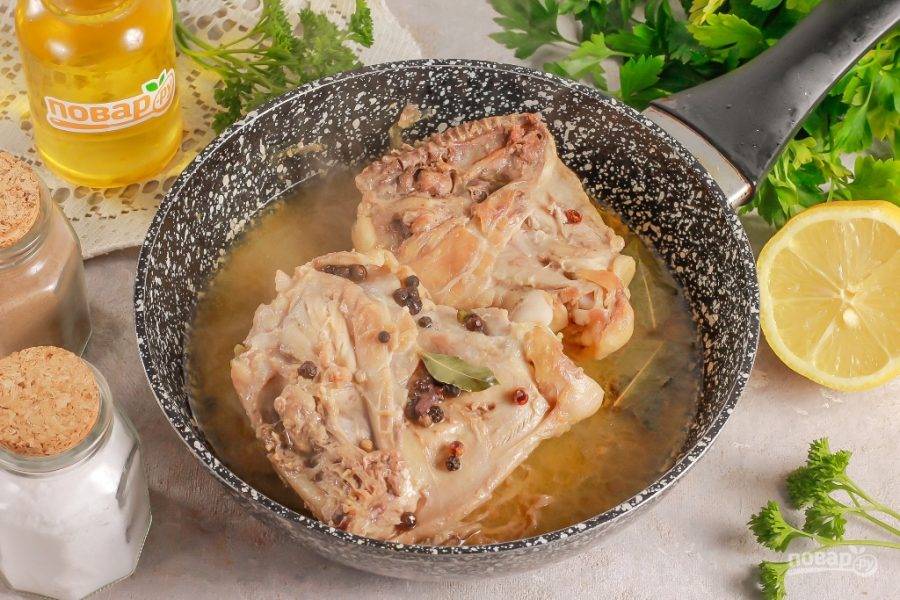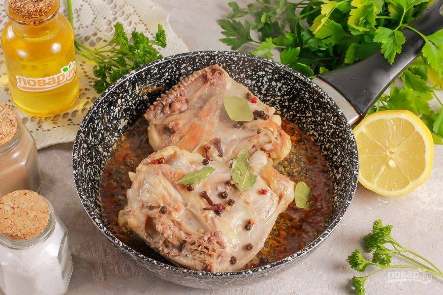 Выжмите из половины лимона сок на поджаренные части курицы, всыпьте горошины перца, гвоздику и лавровые листья.