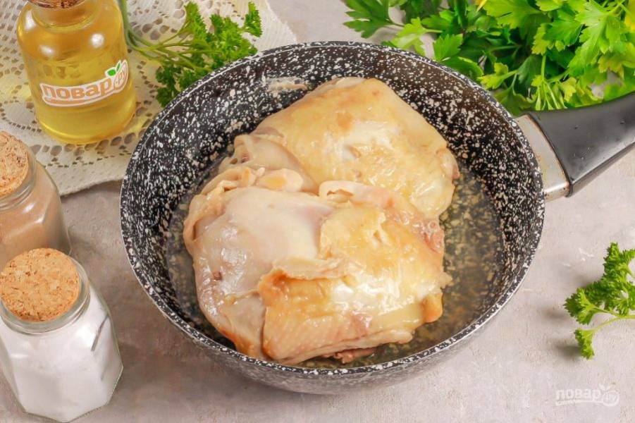 Раскалите растительное масло и обжарьте курицу по 5-6 минут с каждой стороны, сначала выкладывая ее кожей вниз в раскаленное масло.