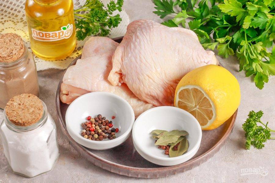 Подготовьте указанные ингредиенты. Выбирайте мясистые части курицы для приготовления блюда: голени, бедра, окорочка.