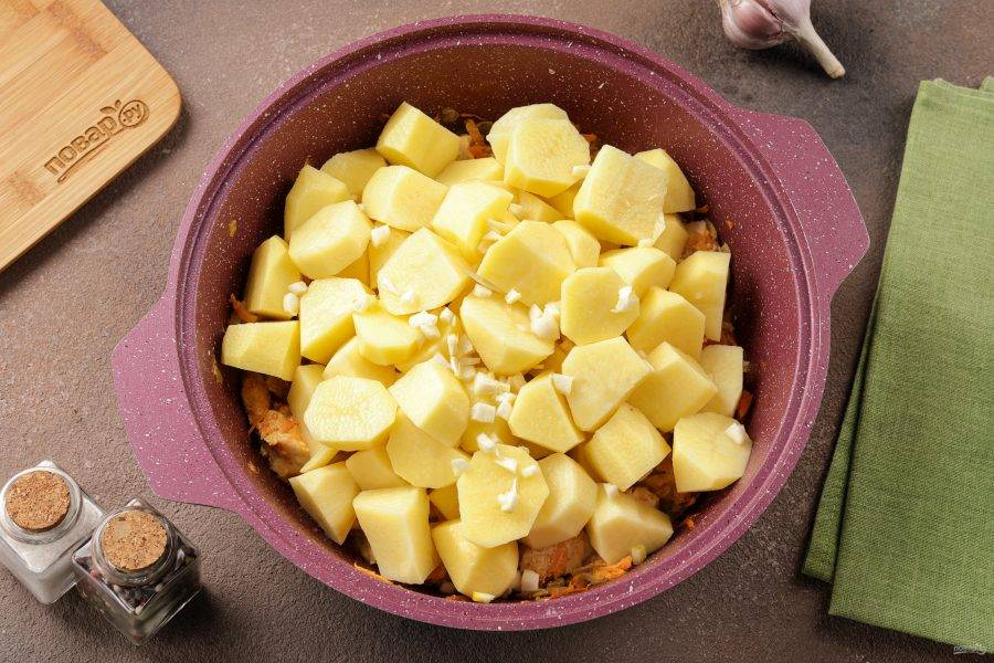 Затем добавьте нарезанный кусочками картофель и нарезанный мелкими кубиками чеснок.